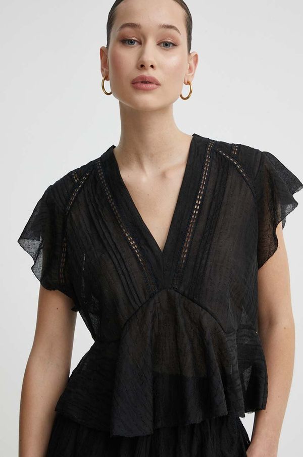 - Lyocell je tkanina nalik na svilu izrađena od drvene celuloze. Ovaj materijal se proizvodi u održivom proizvodnom procesu, bez upotrebe otrovnih tvari.- Jednostavan kroj koji ne ograničava kretanje.- Kratki rukav.- Dekorativni, V izrez.- Model s ukrasnim volanom.- Tanka, ne elastična tkanina.- Duljina: 49 cm.- Širina ispod pazuha: 44 cm.- Dimenzije navedene za veličinu: 36.