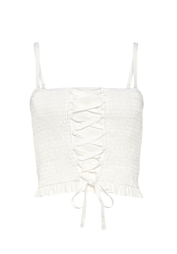 Stil bluze: Bluza majica; Dizajn: Na vezanje/čvor; Materijal: Pamuk; Izrez: Četvrtasti izrez; Uzorak: Jednobojno; Ovratnik: Bez ovratnika; Naramenice: Tanke naramenice; Detalji: Na volane; Dodaci: Uzorak preko cijele površine, Fully fashioned - s crtom na sredini; Kroj: Pripijeni kroj; Dužina rukava: Bez rukava; Dužina: Kraći izrez