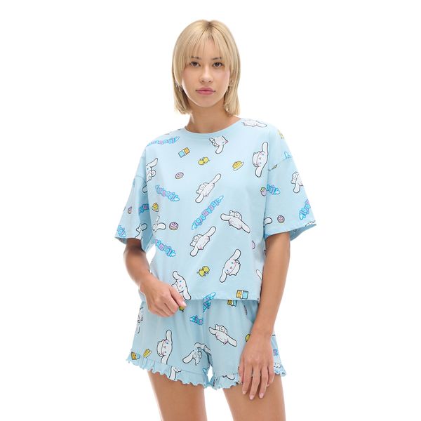 Trendyol Light Blue 100% Cotton Wide Fit T-shirt-Pants with Pockets Printed Knitted Pajamas Set
