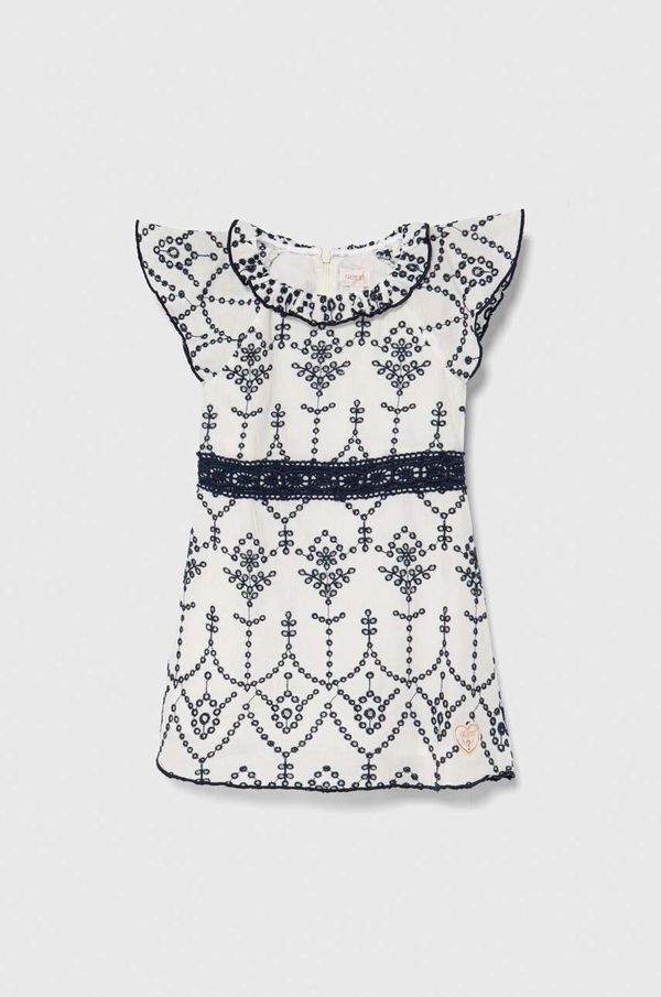 - Kroj raširen prema dolje.- Kratki rukav.- Klasični, okrugli izrez.- Model s ukrasnim volanima.- Skriveni patentni zatvarač.- Model s ukrasnim vezom.- Model s podstavom.- Tanka, ne elastična tkanina.- Duljina: 51 cm.- Širina ispod pazuha: 26 cm.- Dimenzije navedene za visinu: 88-96 cm.
