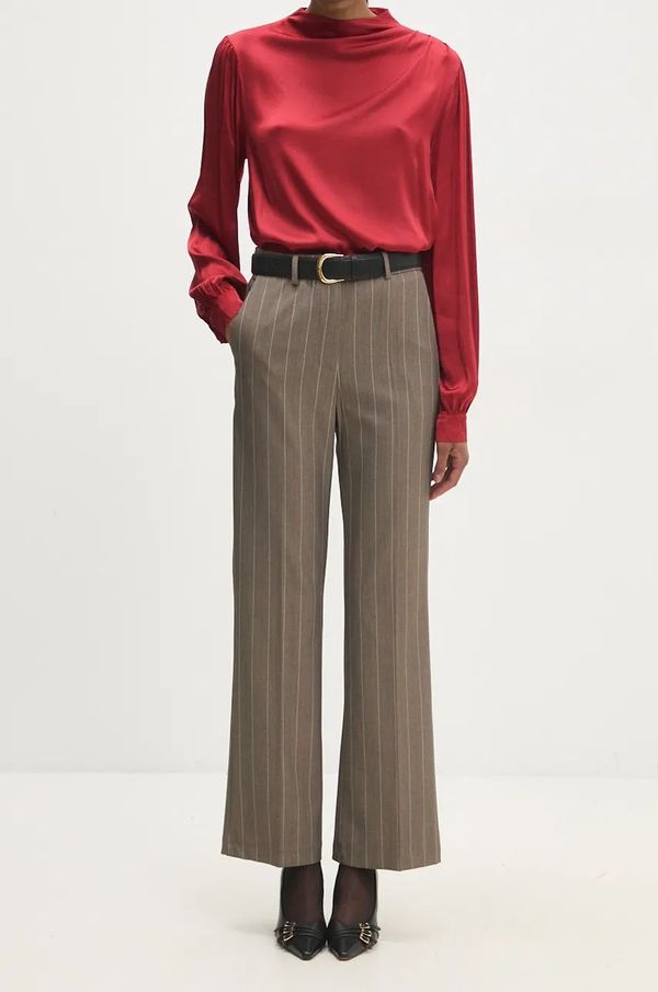 - Jednostavan kroj koji ne ograničava kretanje.- Model s povišenim strukom i kopčanjem gumbima i patentnim zatvaračem.- Nogavica izglačana na crtu.- Dva džepa na prednjoj strani.- Tanka, ne elastična tkanina.- Širina struka: 37 cm.- Širina u bokovima: 45 cm.- Visina struka: 30 cm.- Širina nogavice pri dnu: 24 cm.- Širina nogavice: 27 cm.- Vanjska duljina nogavice 104 cm.- Dimenzije navedene za veličinu: S.