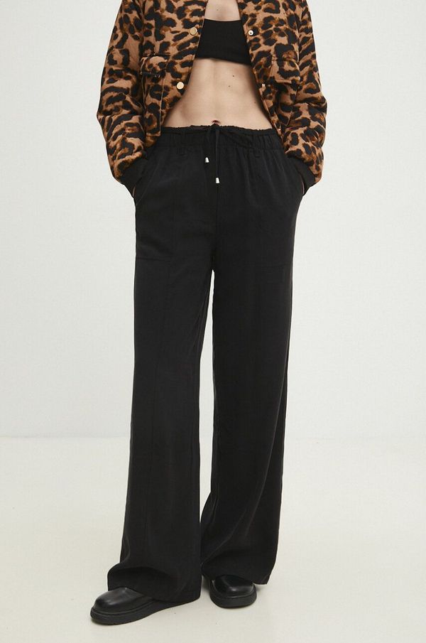 - Hlače širokog kroja u području bokova i bedara.- Ravna nogavica.- Visoki struk s elastičnom trakom.- Uz model dolazi remen od tekstila.- Dva džepa na prednjoj strani.- Dva džepa na stražnjici.- Širina struka: 34 cm.- Širina u bokovima: 55 cm.- Visina struka: 32 cm.- Širina nogavice pri dnu: 30 cm.- Širina nogavice: 32 cm.- Vanjska duljina nogavice 107 cm.- Dimenzije navedene za veličinu: S.