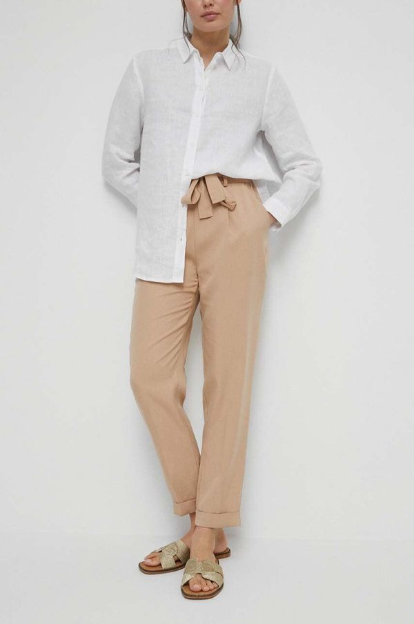 - Kroj carrot.- Uvlačni džepovi.- Srednje visoki struk.- Elastična guma oko struka.- Glatka tkanina.- Vezanje u struku.- Širina struka: 36 cm.- Širina oko kukova: 51 cm.- Visina struka: 28,5 cm.- Širina nogavice dolje: 16 cm.- Širina nogavice: 30 cm.- Duljina unutarnjeg ruba nogavice: 68 cm.- Dimenzije navedene za veličinu: S.