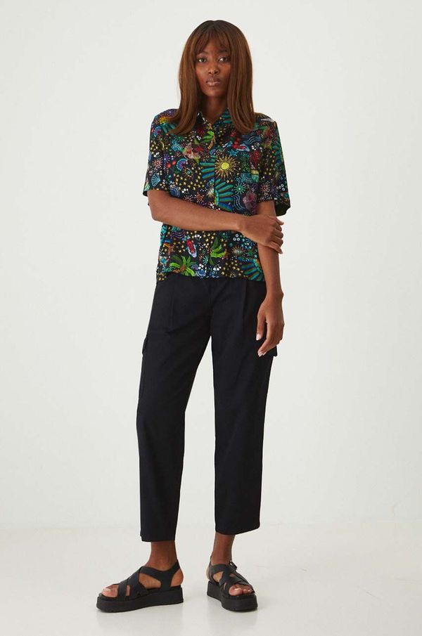 - Kroj regular.- Model sa srednje visokim strukom i kopčanjem na gumb i patentni zatvarač.- Uvlačni džepovi.- Kargo džepovi.- Ukrasne faldice.- Tkanina bez uzorka.- Širina struka: 39 cm.- Širina u bokovima: 52,5 cm.- Visina struka: 27,7 cm.- Širina nogavice pri dnu: 18,5 cm.- Duljina unutarnjeg ruba nogavice: 71 cm.- Dimenzije navedene za veličinu: S.