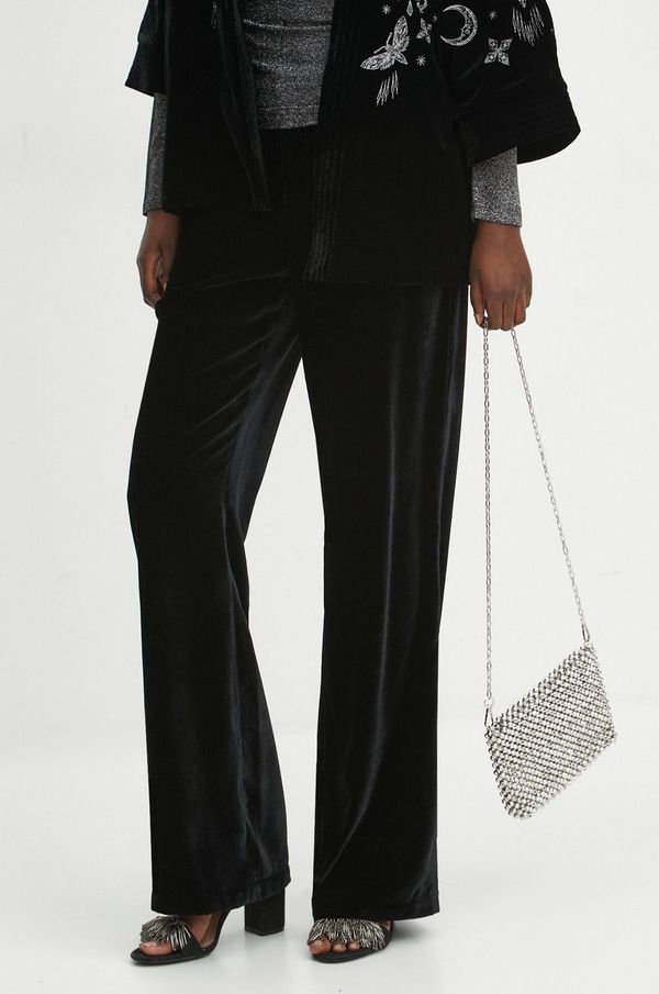 - Kroj wide leg.- Povišen struk.- Široka nogavica.- Model od velura.- Širina struka: 37,5 cm.- Širina u bokovima: 52 cm.- Visina struka: 26,5 cm.- Širina nogavice pri dnu: 27,5 cm.- Duljina unutarnjeg ruba nogavice: 83 cm.- Dimenzije navedene za veličinu: S.
