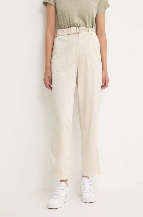 - Hlače blago pripijene u području kukova.- Model s visokim strukom i kopčanjem na patentni zatvarač i kuku.- Elastična traka u struku sprječava klizanje tijekom kretanja.- Ravne nogavice cijelom dužinom.- Dva bočna džepa.- Dva džepa na stražnjici.- Uz model dolazi remen od tekstila.- Širina struka: 36 cm.- Širina u bokovima: 50 cm.- Visina struka: 33 cm.- Širina nogavice pri dnu: 22 cm.- Širina nogavice: 29 cm.- Vanjska duljina nogavice 104 cm.- Dimenzije navedene za veličinu: S.