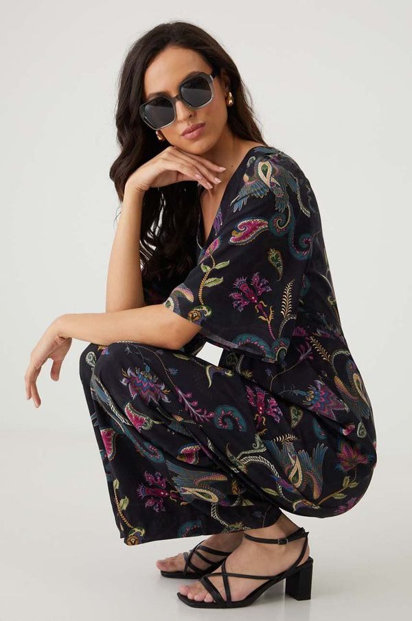 - Kroj regular.- Tričetvrt rukav.- V izrez.- Kopčanje na patentni zatvarač.- Ukrasni nabori.- Široka nogavica.- Tkanina s uzorkom.- Uzorak s biljnim i životinjskim motivom.- Širina ispod pazuha: 48 cm.- Širina struka: 36,5 cm.- Visina struka: 34 cm.- Duljina unutarnjeg ruba nogavice: 75,5 cm.- Dimenzije navedene za veličinu: S.