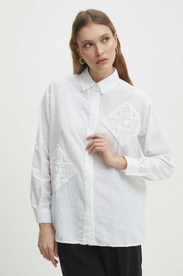 - Široki kroj sa spuštenom linijom ramena.- Manžete na kopčanje gumbima.- Kopčanje na dugmad.- Model s ovratnikom.- Duljina rukava (mjereno od ovratnika): 70 cm.- Duljina: 67 cm.- Širina ispod pazuha: 58 cm.- Dimenzije navedene za veličinu: S.