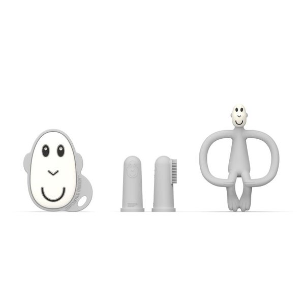 Matchstick Monkey Starter Set Grey, 1 kom, Grickalice za bebe za djecu, Olakšajte i uljepšajte sebi, ili novoj mami iz svoje okoline, brigu o malom djetetu. Set za njegu bebe Matchstick Monkey Starter Set Grey sadrži mnoštvo neophodnih proizvoda koji će oduševiti svaku brižnu mamicu. S ovim praktičnim setom ne možete pogriješiti. Svojstva: olakšava bolove u desnima tijekom rasta zubi izvrsno leži u dječjim ručicama razigrani dizajn za djecu Set sadrži: Grey grickalica za bebe sa četkicom 2 u 1 1 kom Grey grickalica za bebe 1 kom Grey dječja četkica za zube na prst 2 kom