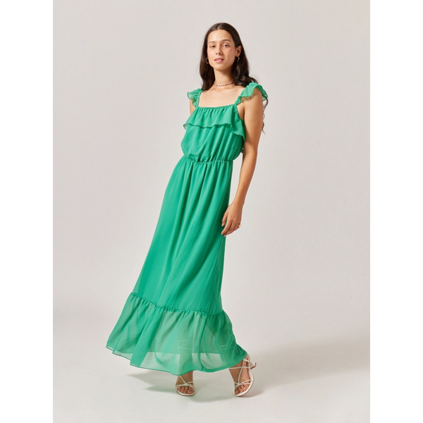 Naf Naf haljina. Savršena za ljetnu sezonu. Duga, jednostavnog kroja koji daje efekt lakoće i vrlo traženu boemsku stranu. Lepršava, s detaljima volana. Elastični ovratnik, naramenice i struk. Model je visok 176 cm i nosi veličinu 36.