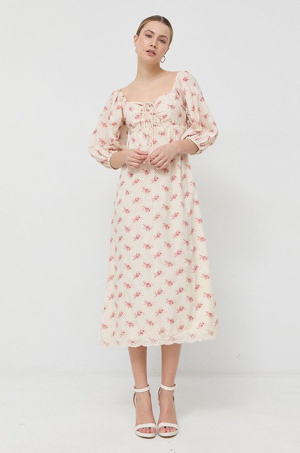 - Kroj raširen prema dolje.- Ukrasni nabori.- Model s podstavom.- Sakriven zatvarač na ciferšlus.- Tanka, ne elastična tkanina.- Duljina: 124 cm.- Širina ispod pazuha: 37 cm.- Dimenzije navedene za veličinu: 36.