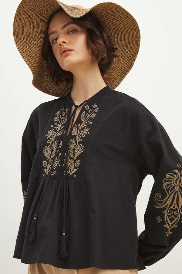 - Kroj regular.- Dugi, puf rukavi.- Spuštena linija ramena.- Rukavi završeni elastičnom trakom.- V izrez.- Dekolte na vezanje- Ukrasni nabori.- Ukrasni detalji.- Model sa ukrasnim vezom.- Duljina rukava (mjereno od dekoltea): 73 cm.- Duljina: 63 cm.- Širina ispod pazuha: 54 cm.- Dimenzije navedene za veličinu: S.