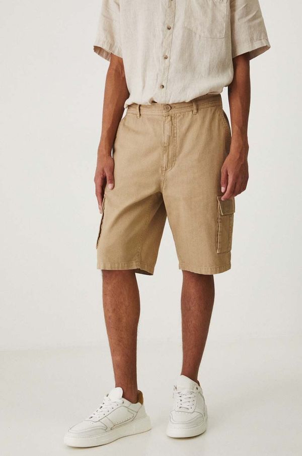 - Kroj loose.- Elastična guma oko struka.- Kopčanje na dugmad i patentni zatvarač.- Uvlačni džepovi.- Kargo džepovi.- Glatka tkanina.- Širina struka (prije rastezanja): 42 cm.- Širina struka (nakon rastezanja): 51 cm.- Širina u bokovima: 56 cm.- Visina struka: 30,7 cm.- Širina nogavice pri dnu: 26,1 cm.- Duljina unutarnjeg ruba nogavice: 27 cm.- Dimenzije navedene za veličinu: L.