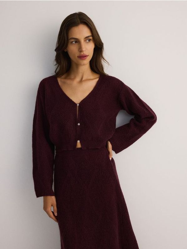 Reserved - LADIES` SWEATER - boja grožđa - kopčanje gumbima,kratki dizajn 100% POLIESTERSKO VLAKNO