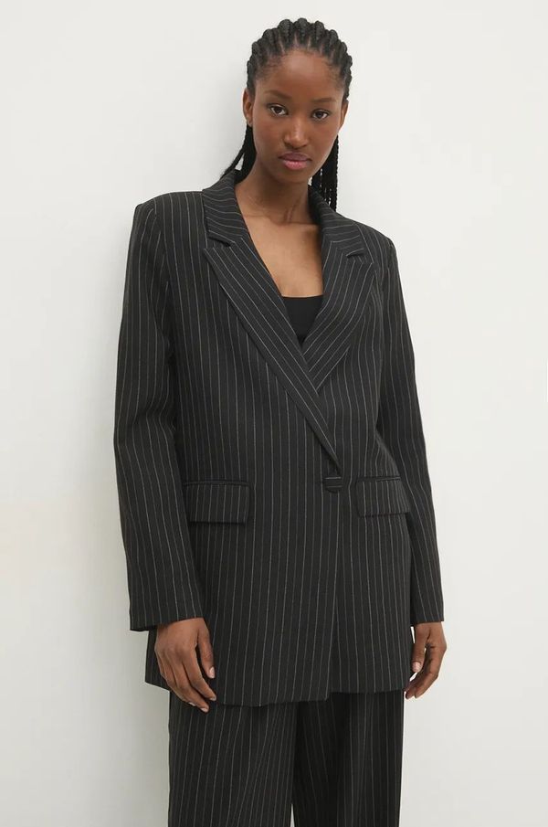 - Jednostavan kroj koji ne ograničava kretanje.- Dugi rukav.- U ramenima ušiveni jastučići.- Klasični preklopi.- Model s podstavom.- Dvoredno kopčanje na gumbe.- Model s džepovima, s ukrasnim elementima.- Duljina rukava: 61,5 cm.- Duljina: 77 cm.- Širina ispod pazuha: 51 cm.- Širina u ramenima: 39 cm.- Dimenzije navedene za veličinu: S.