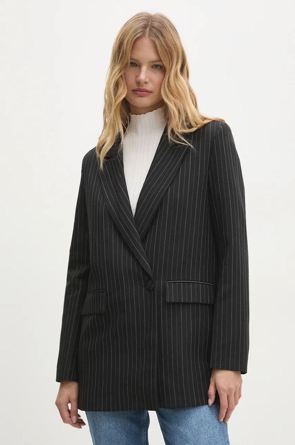 - Jednostavan kroj koji ne ograničava kretanje.- Dugi rukav.- U ramenima ušiveni jastučići.- Klasični preklopi.- Model s podstavom.- Dvoredno kopčanje na gumbe.- Model s džepovima, s ukrasnim elementima.- Duljina rukava: 60 cm.- Duljina: 76 cm.- Širina ispod pazuha: 51 cm.- Širina u ramenima: 41 cm.- Dimenzije navedene za veličinu: S.