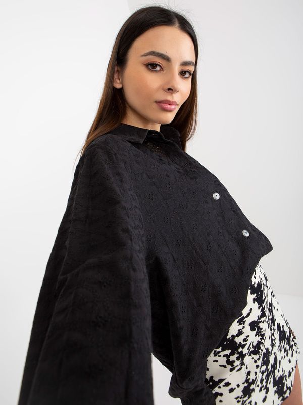 Black openwork oversize shirt with embroidery. Product code: LK-KS-508925.23PDominant pattern: openwork, embroideryStyle: Casualoccasion: casual, city, walk, summer The model is wearing a size S/M. Model's measurements: height 175 cm, bust 84 cm, waist 61 cm, hips 91 cm. Measurements of the shirt in size S/M measured flat: armpit width - 59 cm, sleeve length - 60 cm, total length (front) - 64 cm, total length (back) - 72 cm.