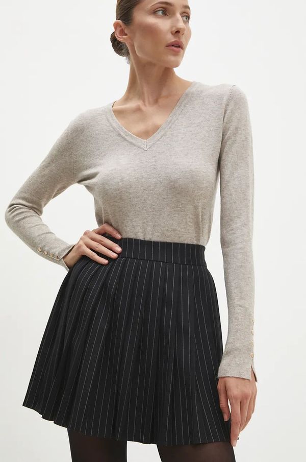 - Kroj raširen prema dolje.- Model s visokim strukom i bočno kopčanje patentnim zatvaračem.- Model bez podstave.- Plisirani model.- Tanka, ne elastična tkanina.- Širina struka: 33 cm.- Duljina: 42 cm.- Dimenzije navedene za veličinu: S.