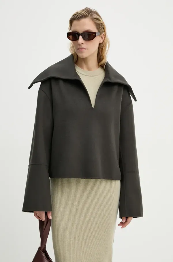 - Široki kroj za potpunu slobodu kretanja.- Dekorativni, V izrez.- Model s ovratnikom.- Kroj rukava sa spuštenom linijom ramena osigurava pokretljivost.- Debelo, ne elastično pletivo.- Duljina rukava (mjereno od ovratnika): 78 cm.- Duljina: 57 cm.- Širina ispod pazuha: 61 cm.- Dimenzije navedene za veličinu: S.