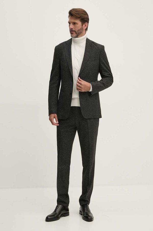 - Kroj slim.- Klasični preklopi.- Model s podstavom.- Jednoredno kopčanje gumbima.- Uvlačni džepovi.- Hlače blago pripijene u području kukova.- Jako sužene, uske nogavice.- Model s regularnim strukom i kopčanjem na patentni zatvarač i kuku.- Duljina rukava: 67 cm.- Duljina: 74 cm.- Širina ispod pazuha: 51 cm.- Širina u ramenima: 43 cm.- Širina struka: 43 cm.- Širina u bokovima: 56 cm.- Visina struka: 28 cm.- Širina nogavice pri dnu: 18 cm.- Širina nogavice: 30,5 cm.- Duljina nogavice: 108 cm.- Dimenzije navedene za veličinu: 48.